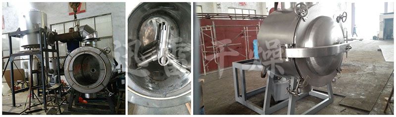 被干燥物料从壳体上方正中间加入,在不断转动的耙齿的搅拌下,物料与壳体壁接触时,表面不断更新,被干燥物料受到热源间接加热,而使物料湿份气化,气化的湿份由真空泵及时抽走。由于操作真空度较高,被干燥物料表面湿份蒸气压力远大于干燥机壳体内蒸发空间的湿份蒸气压力,从而有利于被干燥物料内部湿份和表面湿份的排出,有利于被干燥物料的水分子运动,达到干燥目的。